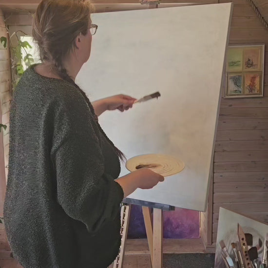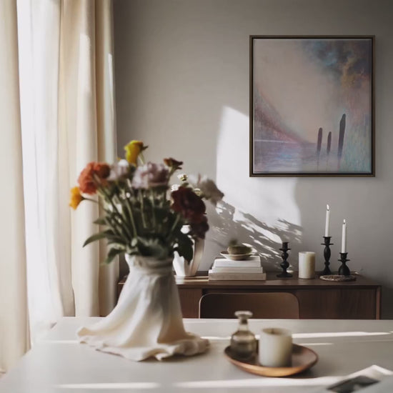 The painting takes you into a dreamy universe, where shadowy silhouettes rise against a backdrop of golden and soft color shifts, a meeting between the earthly and the heavenly. Each brushstroke carries a story of transformation, hope, and the strength that arises when we dare to step into the unknown.