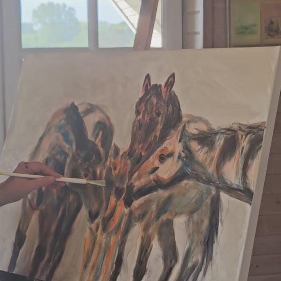 Tre heste danner en cirkel omkring et føl, mule ved mule og skulder ved skulder, som et levende skjold af beskyttelse og varme. Deres tilstedeværelse udtrykker både styrke og blidhed, hvor hvert eneste penselstrøg fremkalder følelsen af at være set, holdt og elsket. De naturlige jordfarver forenes med et drømmende lys, som skaber en atmosfære af ro og balance, et sted hvor sjælen kan finde hvile.