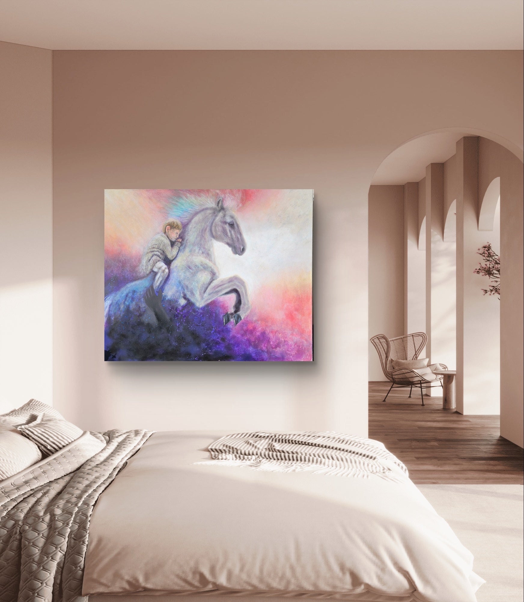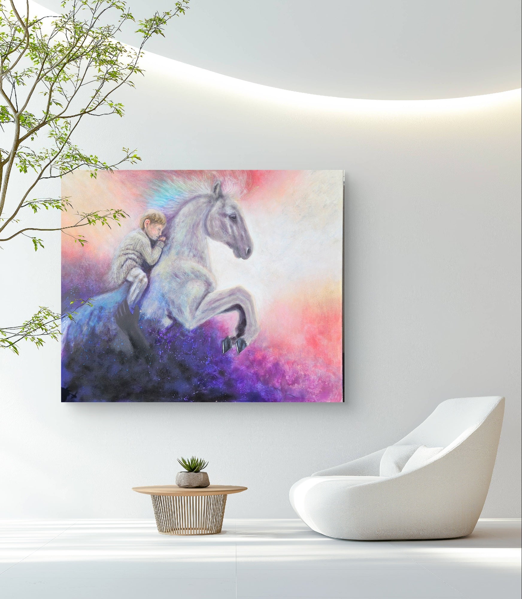 A white horse – wild, determined, otherworldly – bursts through the dark, carrying the sleeping child away.
